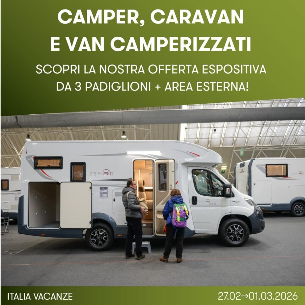 ITALIA VACANZE nasce nel 1975 allo scopo di riunire tutto il mondo commerciale dedicato alle vacanze all’aria aperta. Ogni anno le pubblicazioni specializzate e la rete informativa dei luoghi da visitare affiancano produttori, rivenditori retail e commercianti che qui mostrano le novità di mercato e la migliore selezione del settore merceologico di riferimento. Nello specifico, ci saranno 10000 mq di spazio espositivo focalizzato su camper, caravan, van camperizzati, accessori di ogni tipo e associazioni di settore.